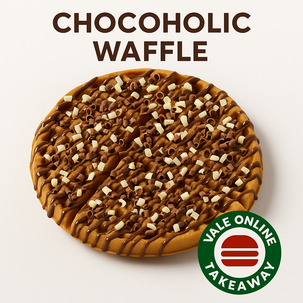 A warm, round Belgian waffle drizzled with smooth milk chocolate sauce and finished with a generous sprinkle of milk and white chocolate curls for an indulgent chocolate delight.